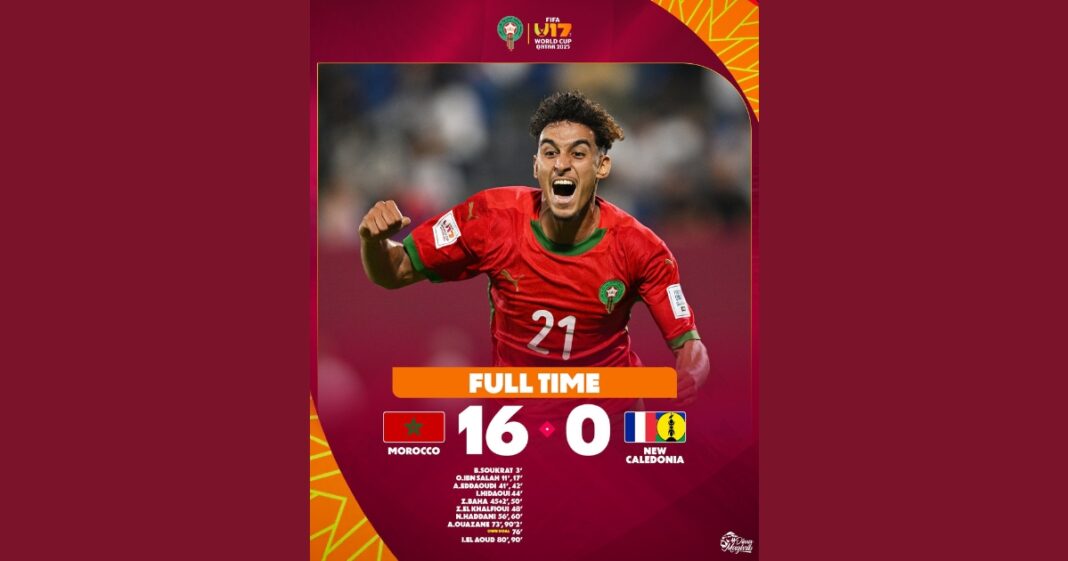 L’équipe nationale marocaine des moins de 17 ans s’est imposée face à la Nouvelle-Calédonie sur le score de 16 à 0, dimanche, lors de la phase de groupes de la Coupe du monde U17, validant ainsi son billet pour les huitièmes de finale.